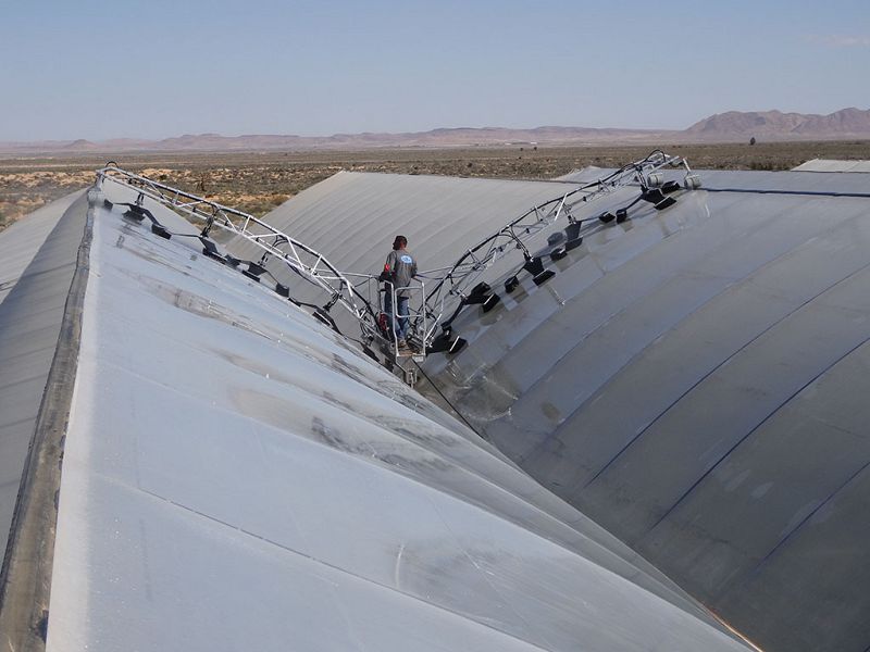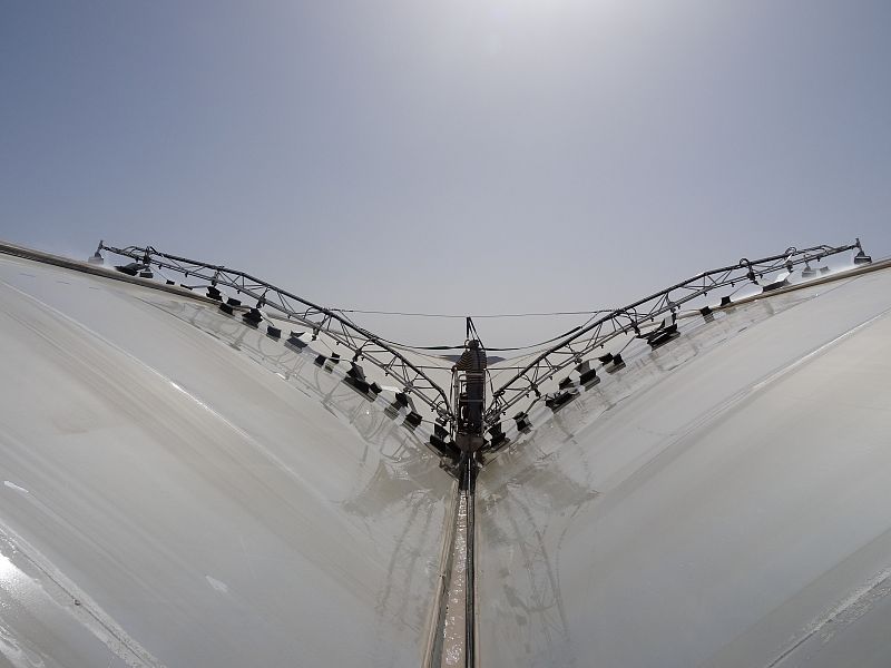 This deck washer drives through one greenhouse gutter, with on the left and right a long arm fitted with hydraulically driven brush discs. At the end of both arms a soft support roller is mounted which rests on the ridge pipe and keeps the deck cleaner in balance. The arms are dismountable and available in different lengths. This makes it possible to use one machine on greenhouses with different roof widths. For example, on a 12.80 and 9.60 meter bay.