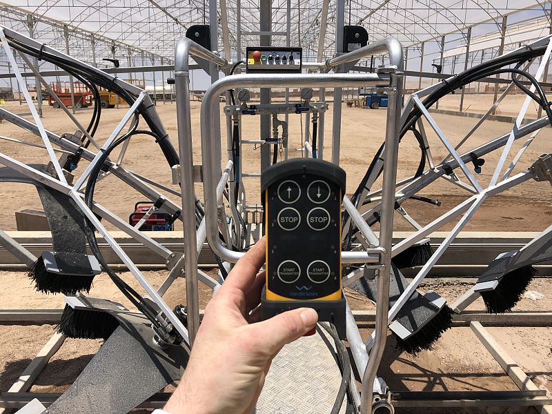 The Top Cleaner Poly drags a water hose behind it. This water hose is connected to a hose reel with a high pressure water pump, which is on the ground. The high-pressure pump has a large flow rate so that a generous amount of water flows onto the foil during washing.